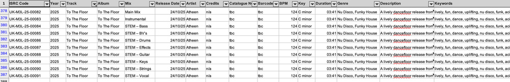 With the visuals in the bag, it’s time to don your ‘record label’ hat. Start by organising your track’s metadata, ideally in a spreadsheet like Excel, with columns for ISRC, track and product titles, mix version, release date, credits, duration, catalogue number, bpm, key, genre, description, and keywords. Not all of that is strictly required for release, but it will make promotion and uploads to sync platforms much easier.
