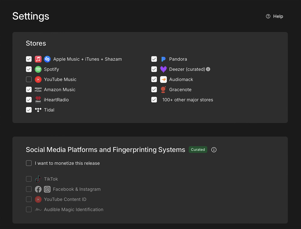 You can choose which of the major platforms your release will be distributed to, and have the option to distribute to numerous smaller sites and stores too.You can choose which of the major platforms your release will be distributed to, and have the option to distribute to numerous smaller sites and stores too.