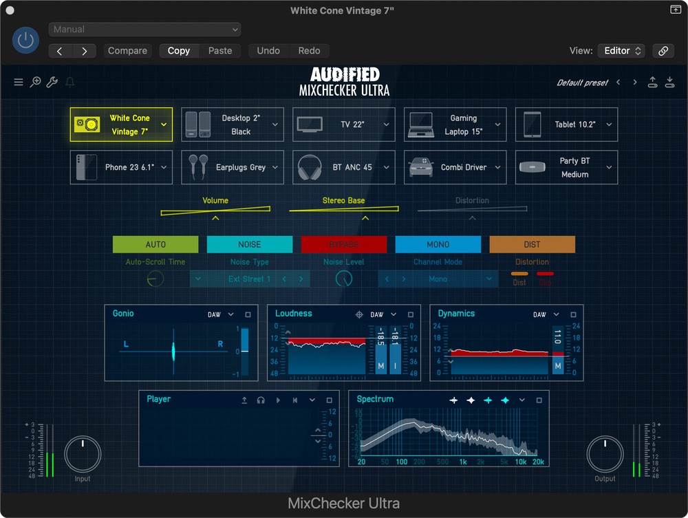 Finally, we come to MixChecker Ultra. This one isn’t intended as a processor, but it can be used as one, as well as being a handy mix referencing tool. The idea is that it mimics how your track will sound on a range of real‑world playback devices in different listening environments. With over 90 device simulations (phones, laptops, car systems, small bluetooth speakers, club PA, etc), plus impulse‑response support, you can test how your mix will translate outside your studio. The built‑in meters help you to compare loudness, phase, dynamics and more.