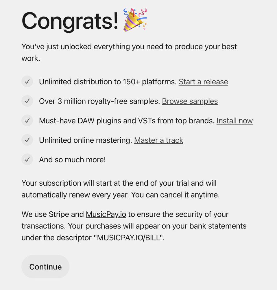 Once your masters are finalised, you can even set a release in motion as we described in much more detail last month — the option to fully release your tracks is included in the trial!
