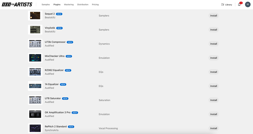 In case you’re completely new to this, creating an SOSFA account is really straightforward: just provide an email address and password, and you can then immediately access the dashboard. The GUI is pretty clean and we hope you’ll find it intuitively organised! At the top are four main tabs: Samples, Plugins, Mastering and Distribution. Clicking on a tab takes you to a brief overview of what you can do, and even the free version of SOSFA allows for meaningful exploration of what’s on offer. Even if you’re just starting out, you should find it easy enough to navigate that you can jump straight into previewing loops, structuring tracks and planning a release, all from this single interface.