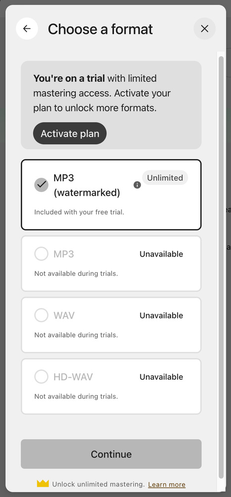 In the Mastering tab, you now have the option of downloading an unlimited number of watermarked MP3 versions of your tracks — this means you can test them in various settings, for example putting them in playlists alongside commercial tracks, which again can be a great way to get a new perspective on your mix, or get feedback from bandmates and so on.