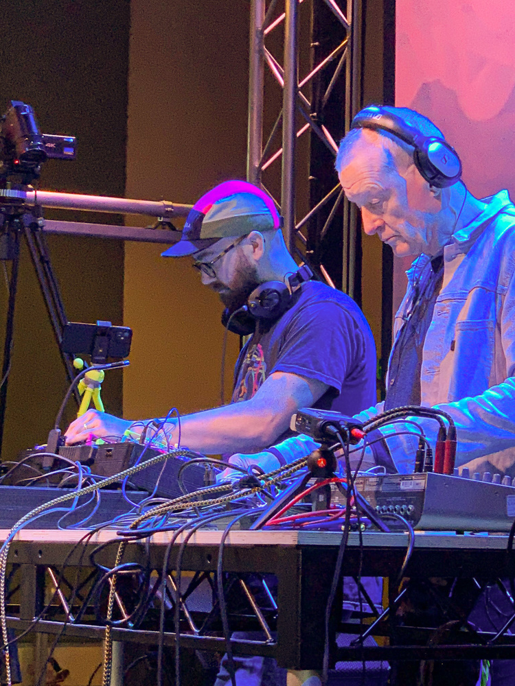 Alex Theakston, aka Mylar Melodies, and Steve Davis.With all the challenges that modular faces, wouldn’t it be less stressful to perform with easier gear? There’s certainly a sense that the logistics could be easier, and part of developing your set is finding more efficient pathways to reduce the size of your rig. But no one wants to lose the joy, excitement and possibility that performing with modular brings. Steve summed this up nicely: “Yeah, sometimes I’ve thought that it would be far easier just whacking everything into a sampler and just rolling up with a Black Box and a few effects, but then I realise that most of the magic moments we have had have arisen from the unplanned stuff and then just running with them. I’m not sure I’d be so sure if I was a solo performer, but within the structure of a three‑person band, there is a lot of time to reflect on that old adage that less is more. I’m pretty sure some of our best music has been when I’ve been scratching my head, holding a patch wire, trying to work out where it was supposed to go!”