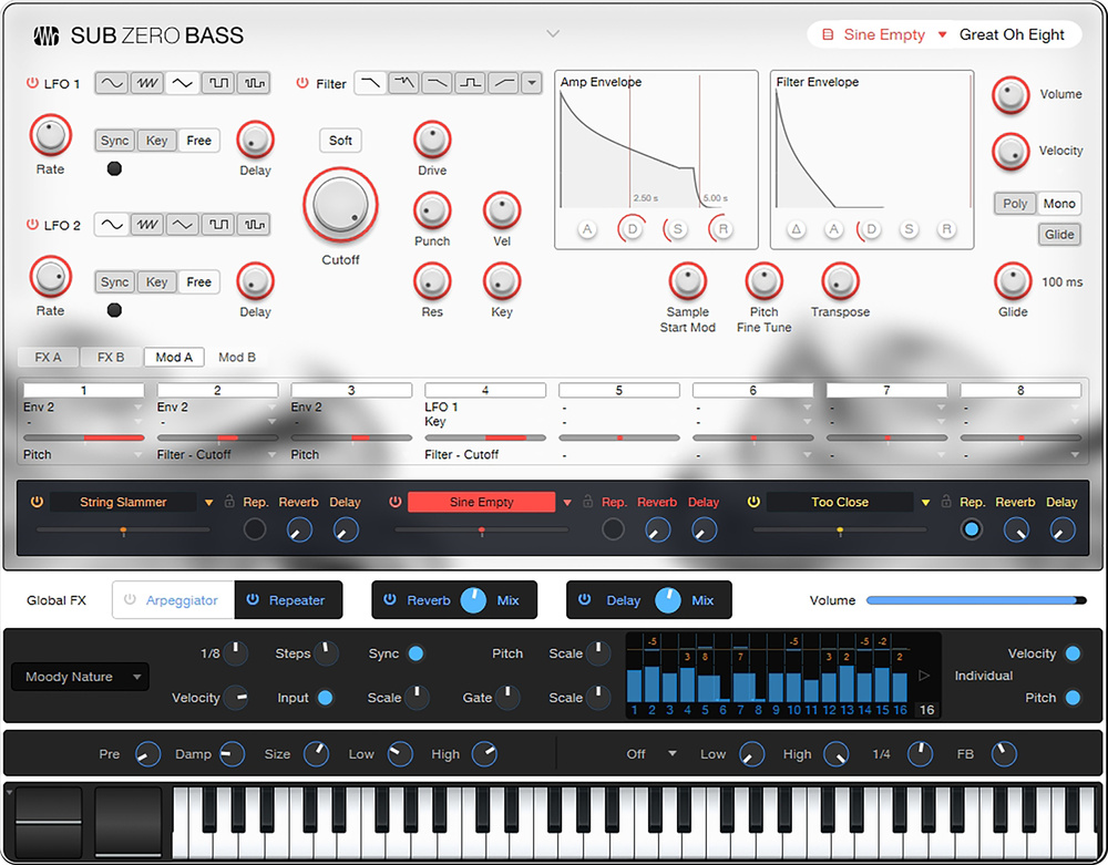 The filter in the middle has nine different types, including multiple low‑pass, high‑pass, band‑pass and notch filters. Along with resonance, you have control over drive, punch, velocity, key following, and you can enable soft‑clipping. The filter can get quite fierce under the right circumstances.