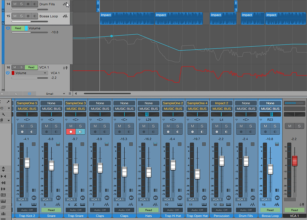 The blue line on the ‘Bossa Loop’ track is that track’s original automation. The VCA channel below it has its own automation, shown in red, and the combination of the two automation lines is shown in grey on the audio track.